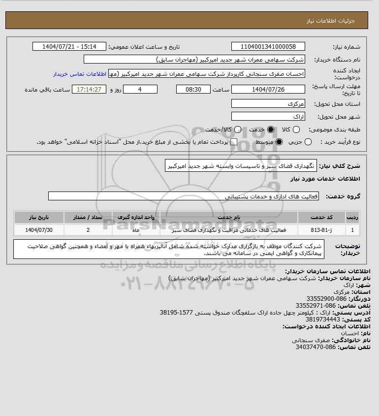 شرح کلی نیاز: نگهداری فضای سبز و تاسیسات وابسته شهر جدید امیرکبیر