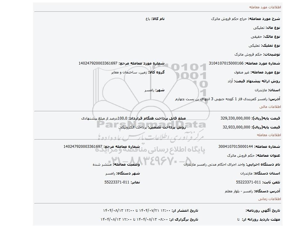 شرح مورد معامله: حراج حکم فروش ماترکنام کالا: باغ