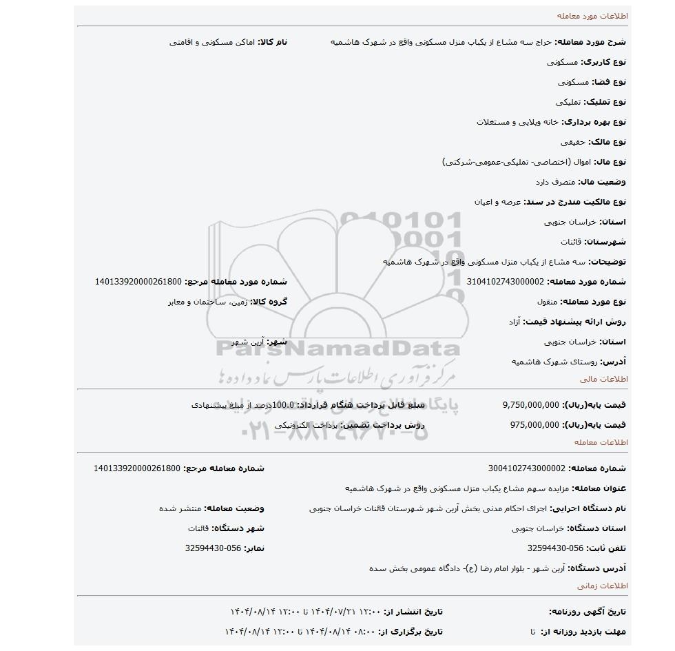 | شرح مورد معامله: حراج سه مشاع از یکباب منزل مسکونی واقع در شهرک هاشمیه | نام کالا: اماکن مسکونی و اقامتی | |