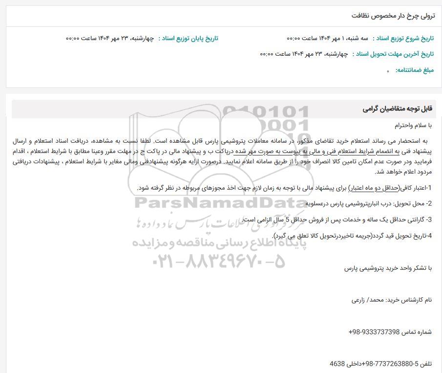 به استحضار میرساند استعلام خرید تقاضای مذکور در سامانه معاملات پتروشیمی پارس قابل مشاهده است. لطفا نسبت به مشاهده دریافت استاد استعلام و ارسال پیشنهاد فنی به انضمام شرایط استعلام فنی و مالی به پیوست به صورت مهر شده در پاکت ب و پیشنهاد مالی در پاکت ج در مهلت مقرر و عينا مطابق با شرایط استعلام ، اقدام فرمایید و در صورت عدم امکان تامین کالا انصراف خود را از طریق سامانه اعلام نمایید در صورت ارایه هرگونه پیشنهاد فنی و مالی مغایر با شرایط استعلام، پیشنهادات دریافتی مردود اعلام خواهد شد.
