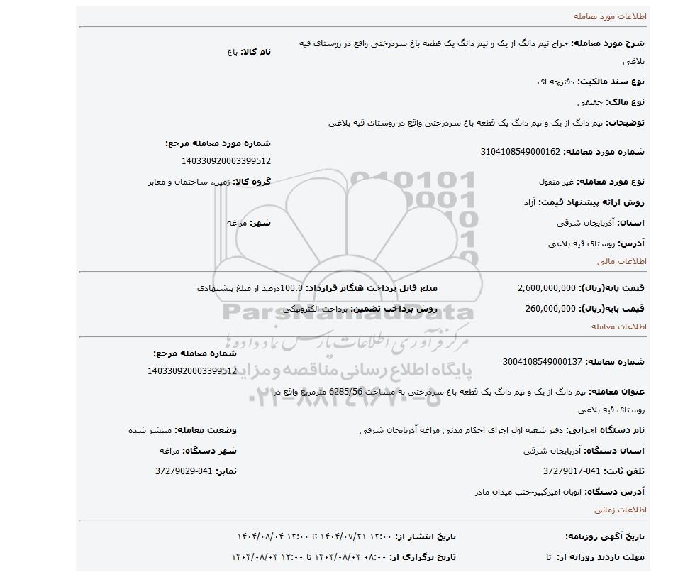 | شرح مورد معامله: حراج نیم دانگ از یک و نیم دانگ یک قطعه باغ سردرختی واقع در روستای قیه بلاغی | نام کالا: باغ | |