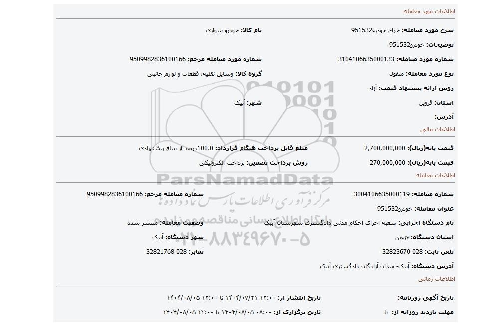 | شماره مورد معامله: 3104106635000133 | شماره مورد معامله مرجع: 9509982836100166 | |