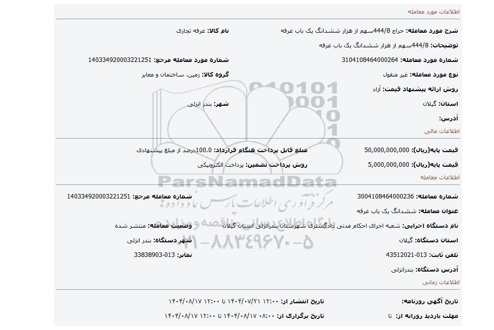 مزایده 444/8سهم از هزار ششدانگ یک باب غرفه, مزایده، 444/8سهم از هزار ششدانگ یک باب غرفه