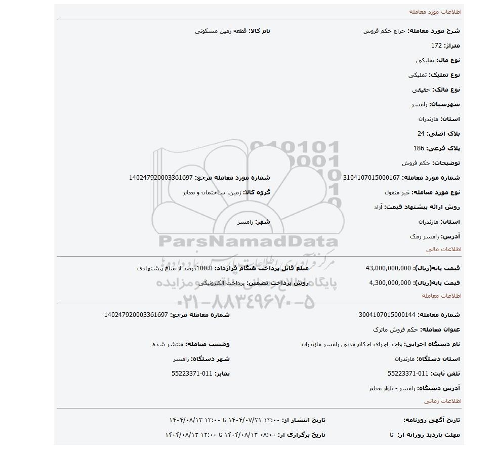| شماره مورد معامله: 3104107015000167 | شماره مورد معامله مرجع: 140247920003361697 | |