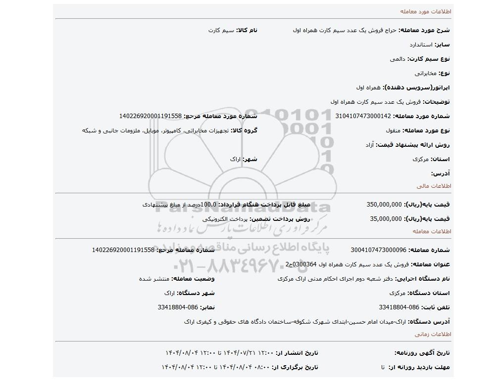 عنوان معامله: فروش یک عدد سیم کارت همراه اول 0300364ج2