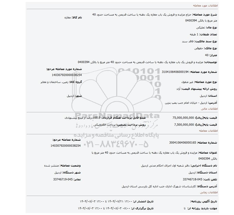 | عنوان معامله: مزایده و فروش یک باب مغازه یک دهنه با ساخت قدیمی به مساحت حدود 40 متر مربع با بالکن 0400394 | ||