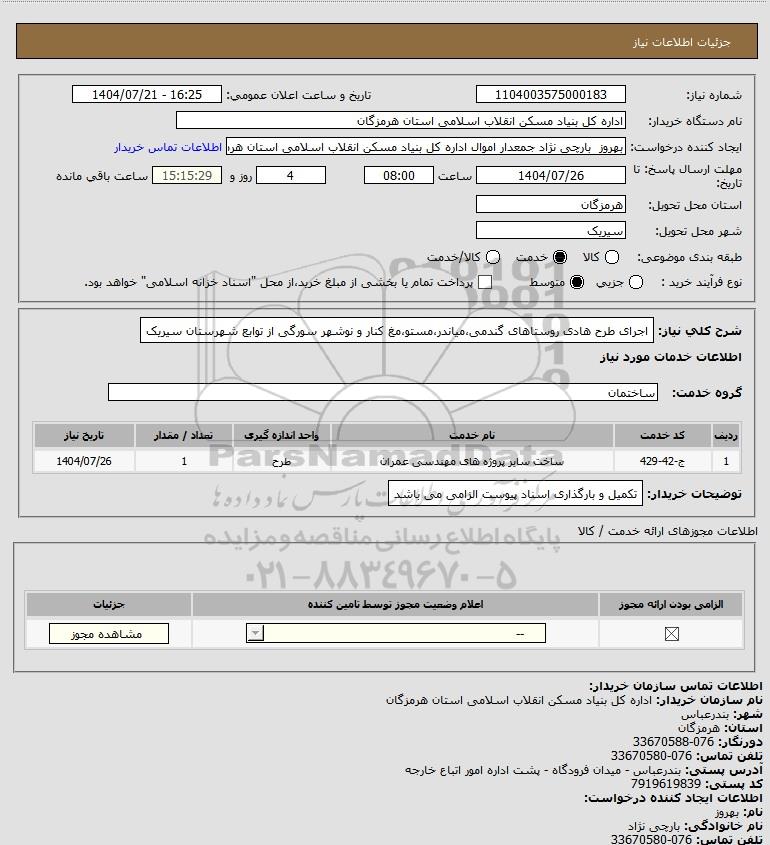 شرح کلی نیاز: اجرای  طرح هادی روستاهای  گندمی،میاندر،مستو،مغ کنار و نوشهر سورگی از توابع شهرستان سیریک