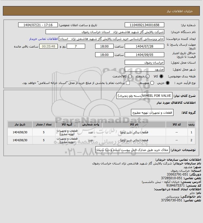 نام دستگاه خریدار:شرکت پالایش گاز شهید هاشمی نژاد استان خراسان رضوی