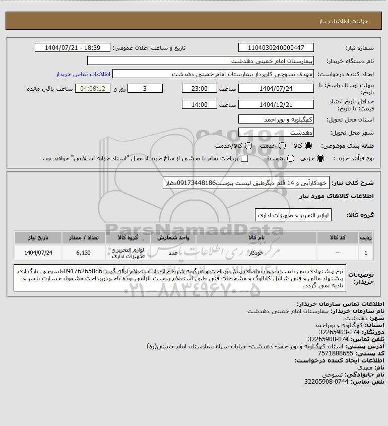 | 1 | -- | خودکار | عدد | لوازم التحریر و تجهیزات اداری | 6,130 | 1404/07/24 |