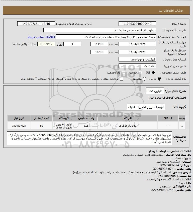 استعلام بها و موضوع استعلام استعلام کارتریج 05A به اطلاع کلیه شرکت‌ها و افراد متخصص واجد شرایط می‌رساند، آگهی گذار در نظر دارد از طریق استعلام بها، نسبت به انتخاب و دریافت پیشنهادات اقدام نماید. این استعلام با کد آگهی ثبت شده در سامانه خبرگزاری پارس نماد : 9693243 منتشر شده است. مشخصات استعلام : تاریخ شروع استعلام: 1404/07/21 آخرین مهلت ارسال پیشنهاد قیمت : 1404/07/24 و محل اجرای پروژه : استان کهگیلویه و بویراحمد میباشد. استعلام قیمت مورد درخواست : استعلام کارتریج 05A با دسته‌بندی‌های تخصصی و گروه های مرتبط : کامپیوتر, ماشین اداری, استعلام اطلاع رسانی میگردد.