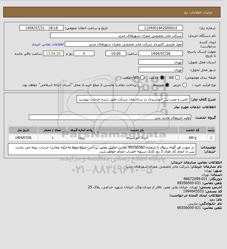 شرح کلی نیاز: تامین و نصب پنل خورشیدی در ساختمان شرکت طبق شرح خدمات پیوست