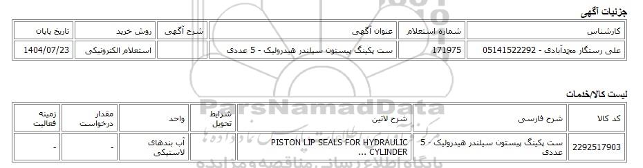 | علی رستگار محمدآبادی - 05141522292 | 171975 | ست پکینگ پیستون سیلندر هیدرولیک - 5 عددی | استعلام الکترونیکی | 1404/07/23 |