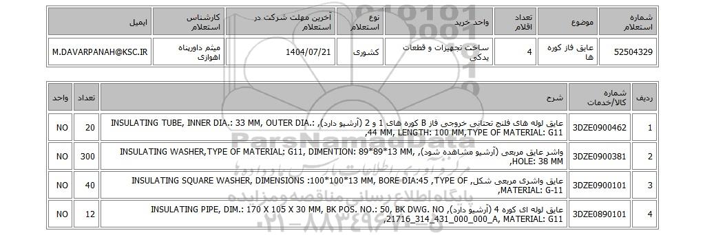 52504329 | عایق فاز کوره ها | 4 | ساخت تجهیزات و قطعات یدکی | کشوری | 1404/07/21 | میثم داورپناه اهوازی | M.DAVARPANAH@KSC.IR |