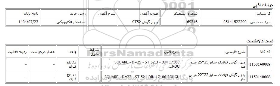| محمد سعادتی - 05141522290 | 169316 | چهار گوش ST52 | استعلام الکترونیکی | 1404/07/23 |