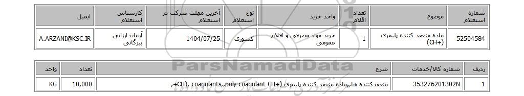 52504584ماده منعقد کننده پلیمری (+CH)1خرید مواد مصرفی و اقلام عمومیکشوری1404/07/25آرمان ارزانی بیرگانیA.ARZANI@KSC.IR