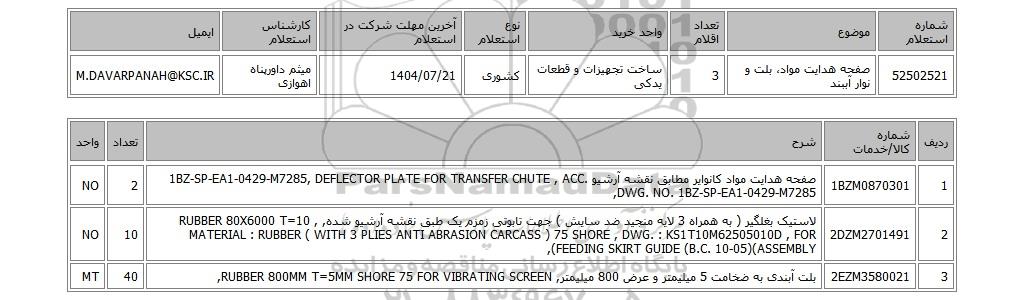 52502521صفحه هدایت مواد، بلت و نوار آببند3ساخت تجهیزات و قطعات یدکیکشوری1404/07/21میثم داورپناه اهوازیM.DAVARPANAH@KSC.IR