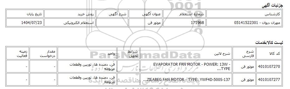| مهران دیوان - 05141522301 | 171968 | موتور فن | استعلام الکترونیکی | 1404/07/23 |