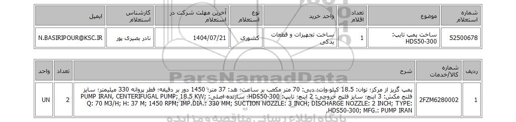 | 52500678 | ساخت پمپ تایپ: HDS50-300 | 1 | ساخت تجهیزات و قطعات یدکی | کشوری | 1404/07/21 | نادر بصیری پور | N.BASIRIPOUR@KSC.IR |