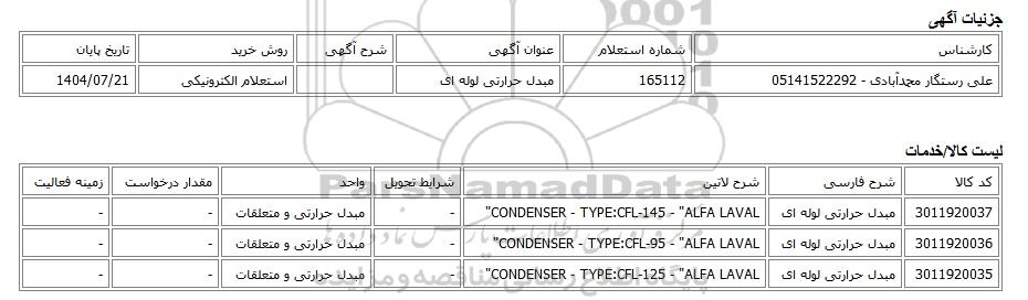 | علی رستگار محمدآبادی - 05141522292 | 165112 | مبدل حرارتی لوله ای | استعلام الکترونیکی | 1404/07/21 |