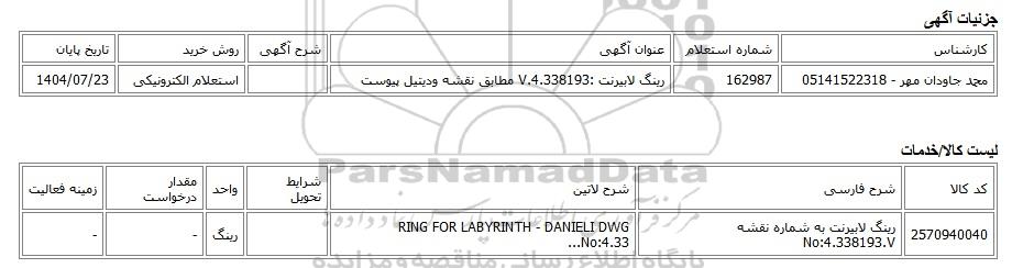 | محمد جاودان مهر - 05141522318 | 162987 | رینگ لابیرنت :4.338193.V مطابق نقشه ودیتیل پیوست | استعلام الکترونیکی | 1404/07/23 |