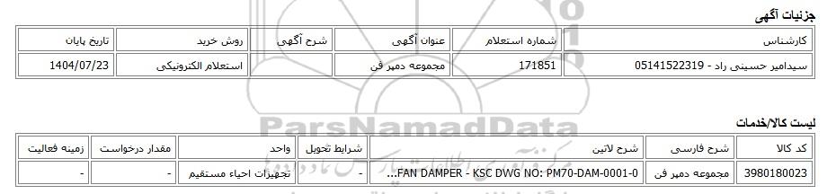 | سیدامیر حسینی راد - 05141522319 | 171851 | مجموعه دمپر فن | استعلام الکترونیکی | 1404/07/23 |