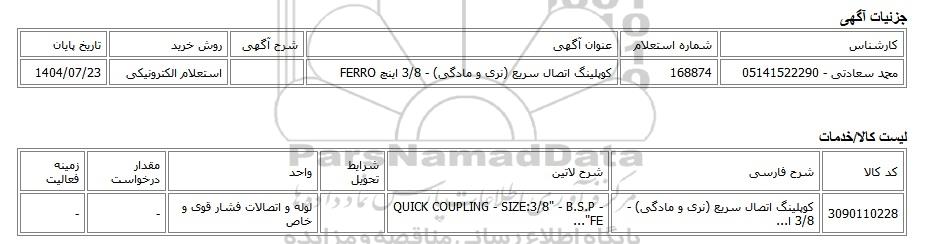 | محمد سعادتی - 05141522290 | 168874 | کوپلینگ اتصال سریع (نری و مادگی) - 3/8 اینچ FERRO | استعلام الکترونیکی | 1404/07/23 |