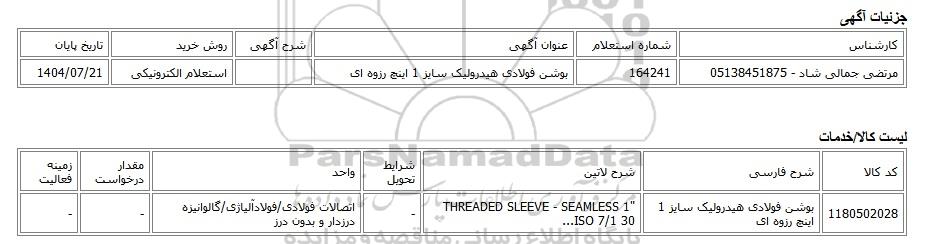 | مرتضی جمالی شاد - 05138451875 | 164241 | بوشن فولادی هیدرولیک سایز 1 اینچ رزوه ای | استعلام الکترونیکی | 1404/07/21 |