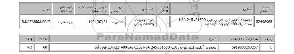 | 52498965 | مجموعه آداپتور کلید هوایی تایپ NSA 245 /3150D پست برق 400 کیلو ولت فولاد آرنا | 1 | خرید تجهیزات وقطعات یدکی | کشوری | 1404/07/21 | بیژن نظری | B.NAZARI@KSC.IR |