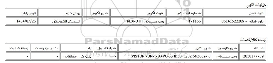 | داود فدائی - 05141522289 | 171156 | پمپ پیستونی REXROTH | استعلام الکترونیکی | 1404/07/26 |