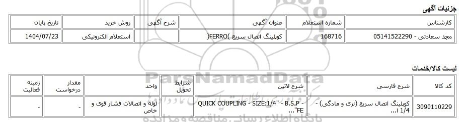 | محمد سعادتی - 05141522290 | 168716 | کوپلینگ اتصال سریع )FERRO( | استعلام الکترونیکی | 1404/07/23 |