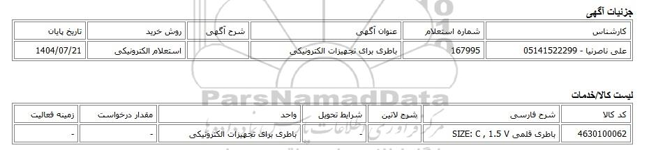 علی ناصرنیا - 05141522299 | 167995 | باطری برای تجهیزات الکترونیکی | استعلام الکترونیکی | 1404/07/21 |