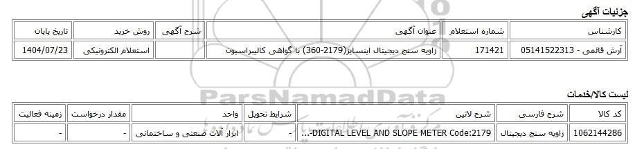 | آرش قائمی - 05141522313 | 171421 | زاویه سنج دیجیتال اینسایز(2179-360) با گواهی کالیبراسیون | استعلام الکترونیکی | 1404/07/23 |