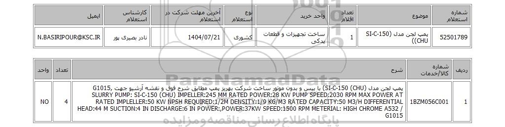 52501789پمپ لجن مدل (SI-C-150 (CHU) 1ساخت تجهیزات و قطعات یدکیکشوری1404/07/21نادر بصیری پورN.BASIRIPOUR@KSC.IR
