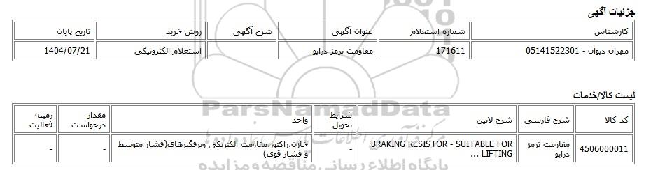 مهران دیوان - 05141522301171611مقاومت ترمز درایواستعلام الکترونیکی1404/07/21