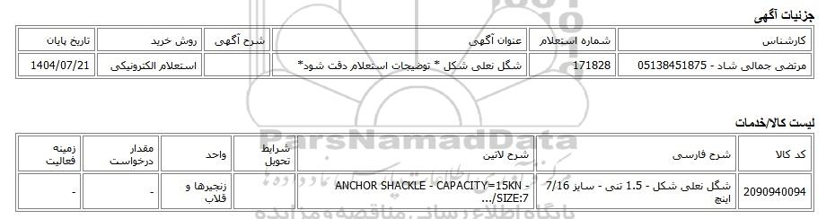 مرتضی جمالی شاد - 05138451875 | 171828 | شگل نعلی شکل * توضیجات استعلام دقت شود* | استعلام الکترونیکی | 1404/07/21 |