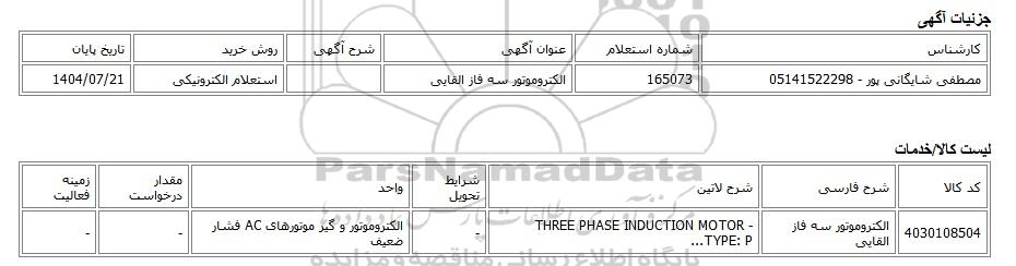 مصطفی شایگانی پور - 05141522298165073الکتروموتور سه فاز القاییاستعلام الکترونیکی1404/07/21