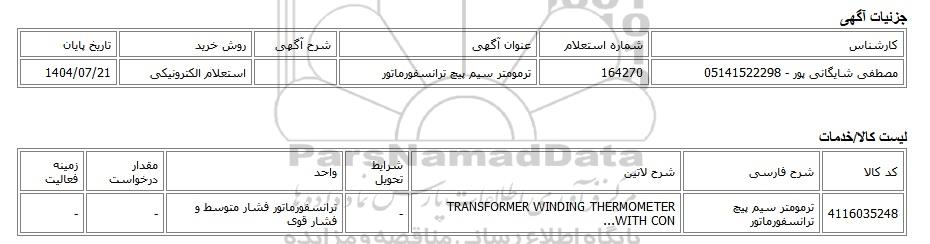 مصطفی شایگانی پور - 05141522298164270ترمومتر سیم پیچ ترانسفورماتوراستعلام الکترونیکی1404/07/21