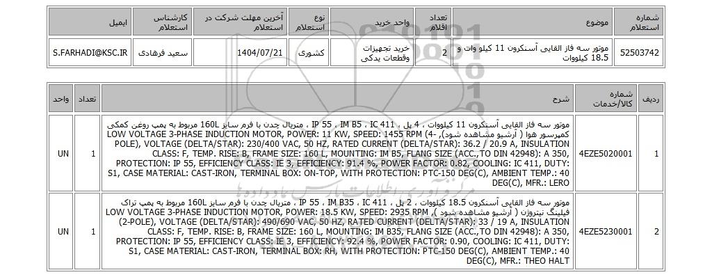 استعلام موتور سه فاز القایی آسنکرون 11 کیلو وات و 18.5 کیلووات, استعلام موتور سه فاز القایی آسنکرون 11 کیلو وات و 18.5 کیلووات