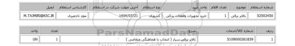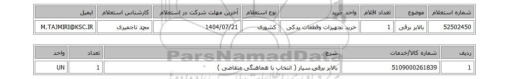 52502450بالابر برقی1خرید تجهیزات وقطعات یدکیکشوری1404/07/21محمد تاجمیریM.TAJMIRI@KSC.IR