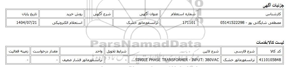 مصطفی شایگانی پور - 05141522298 | 171101 | ترانسفورماتور خشک | استعلام الکترونیکی | 1404/07/21 |
