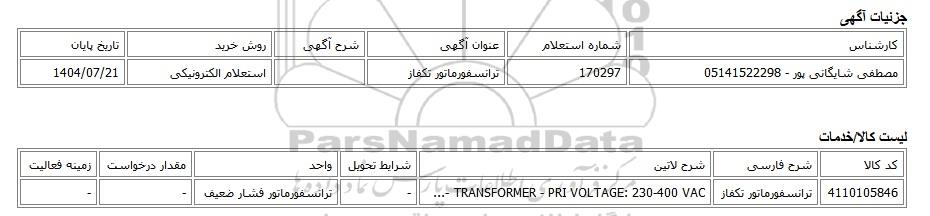 مصطفی شایگانی پور - 05141522298 | 170297 | ترانسفورماتور تکفاز | استعلام الکترونیکی | 1404/07/21 |
