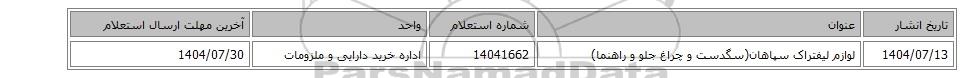| 1404/07/13 | لوازم لیفتراک سپاهان(سگدست و چراغ جلو و راهنما) | 14041662 | اداره خرید دارایی و ملزومات | 1404/07/30 |