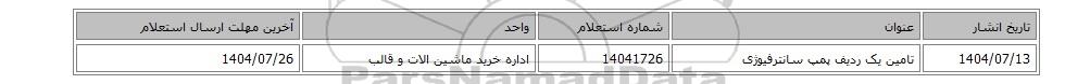 1404/07/13تامین یک ردیف پمپ سانترفیوژی14041726اداره خرید ماشین الات و قالب1404/07/26