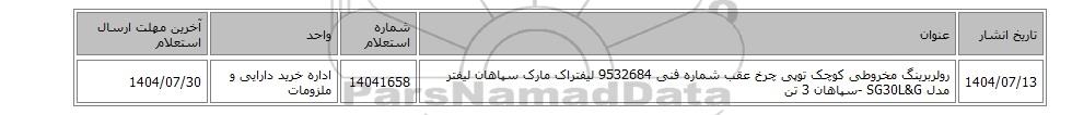 | 1404/07/13 | رولربرینگ مخروطی کوچک توپی چرخ عقب شماره فنی 9532684 لیفتراک مارک سپاهان لیفتر مدل SG30L&G -سپاهان 3 تن | 14041658 | اداره خرید دارایی و ملزومات | 1404/07/30 |