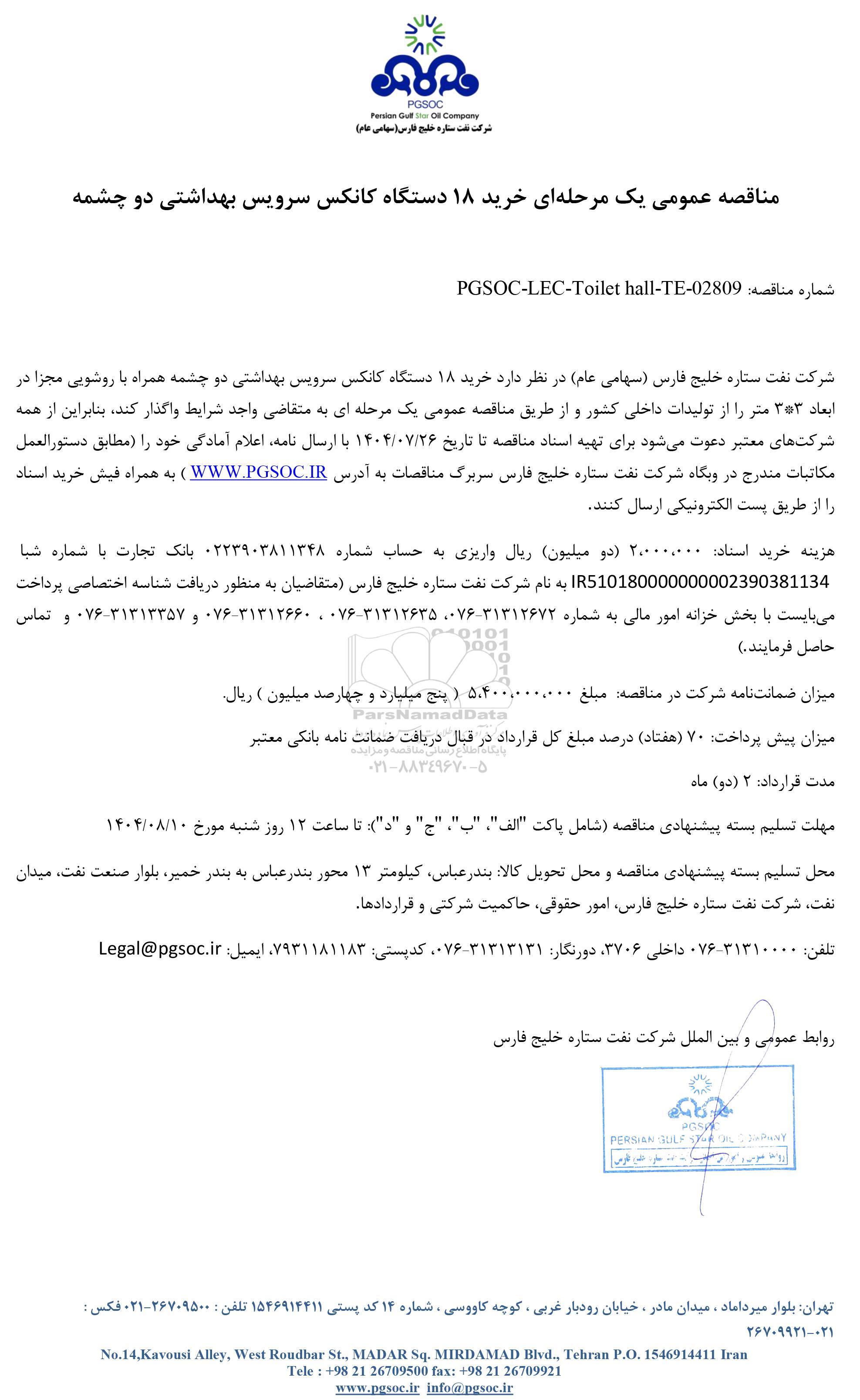 شرکت نفت ستاره خلیج فارس (سهامی عام) در نظر دارد خرید 18 دستگاه کانکس سرویس بهداشتی دو چشمه همراه با روشویی مجزا در ابعاد 3*3 متر را از تولیدات داخلی کشور و از طریق مناقصه عمومی یک مرحله ای به متقاضی واجد شرایط واگذار کند، بنابراین از همه شرکتهای معتبر دعوت میشود برای تهیه اسناد مناقصه تا تاریخ 1404.07.26 با ارسال نامه، اعلام آمادگی خود را (مطابق دستورالعمل مکاتبات مندرج در وبگاه شرکت نفت ستاره خلیج فارس سربرگ مناقصات به آدرس WWW.PGSOC.IR ) به همراه فیش خرید اسناد را از طریق پست الکترونیکی ارسال کنند.