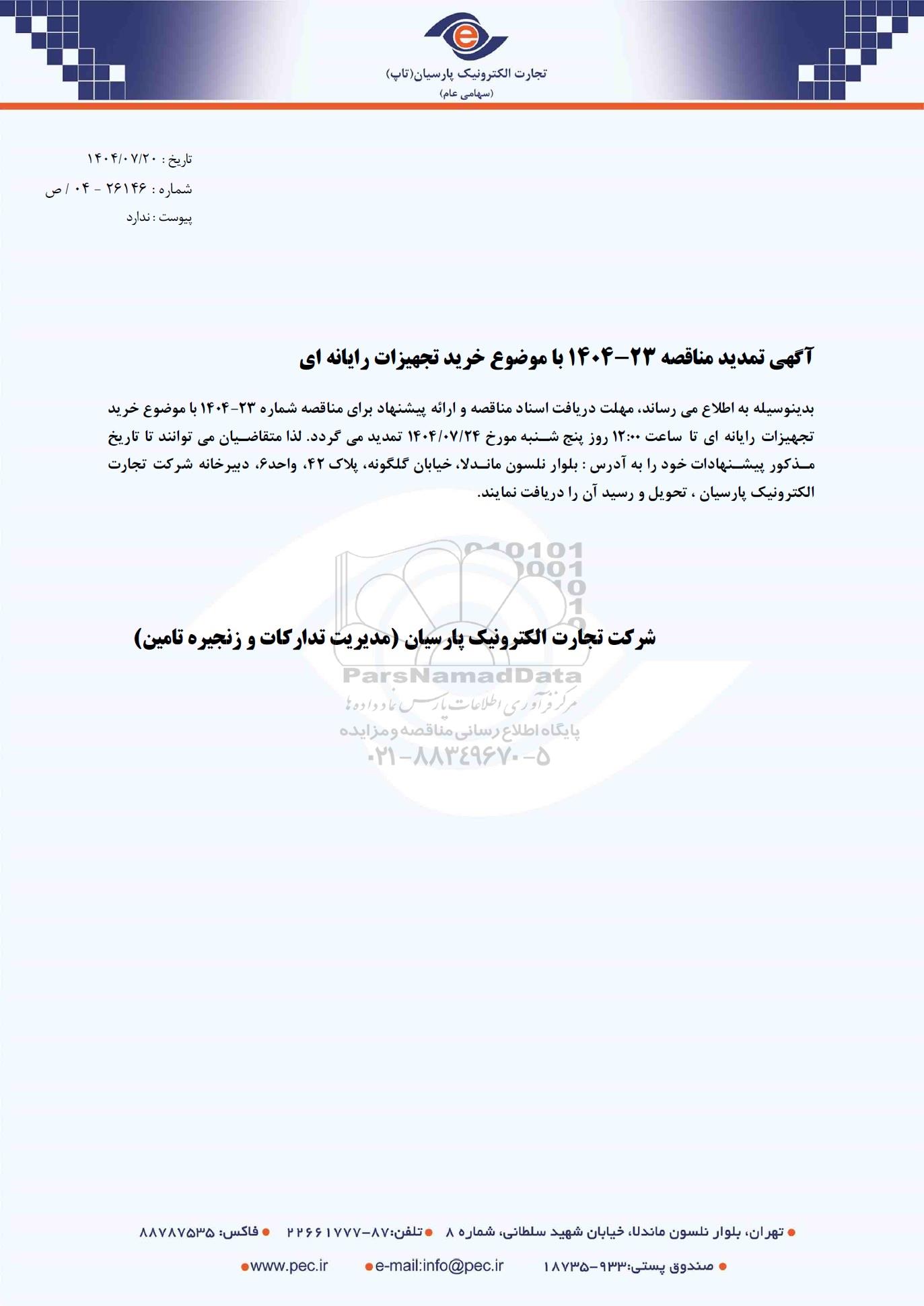 بدینوسیله به اطلاع می رساند، مهلت دریافت اسناد مناقصه و ارائه پیشنهاد برای مناقصه شماره 23 - 1404 با موضوع خرید تجهیزات رایانه ای تا ساعت 12:00 روز پنج شنبه مورخ 1404.07.24 تمدید می گردد. لذا متقاضیان می توانند تا تاریخ مذکور پیشنهادات خود را به آدرس: بلوار نلسون ماندلا، خیابان گلگونه ، پلاک 42، واحد 6 دبیرخانه شرکت تجارت الکترونیک پارسیان، تحویل و رسید آن را دریافت نمایند.