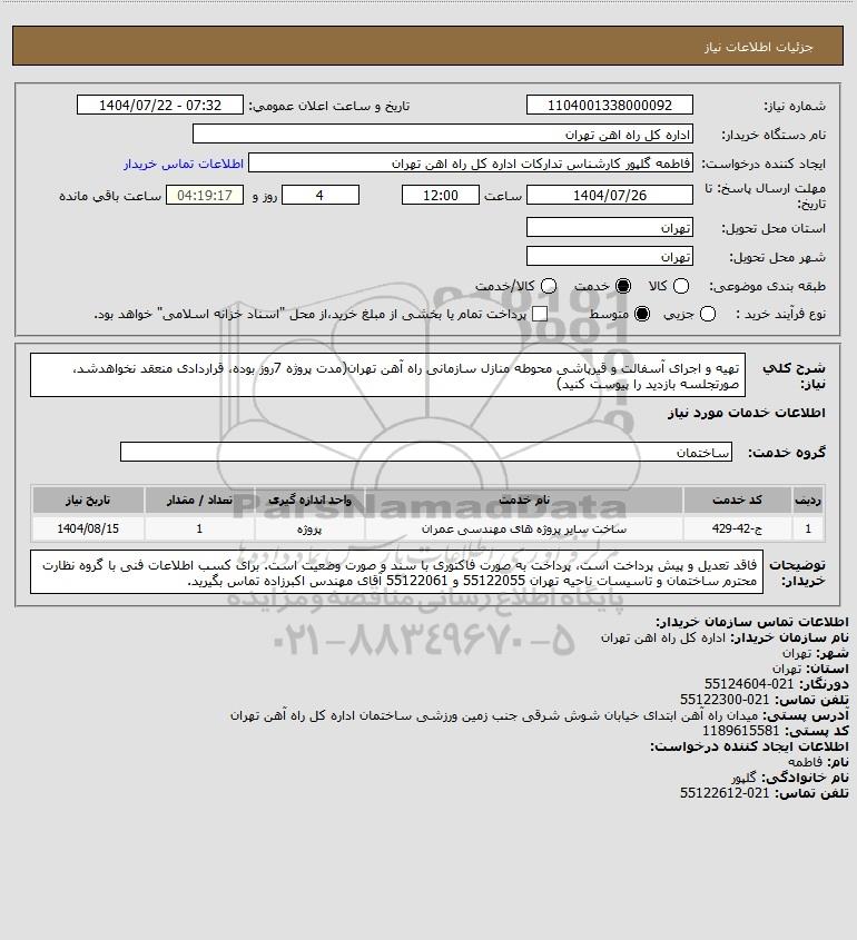 شرح کلی نیاز: تهیه و اجرای آسفالت و قیرپاشی محوطه منازل سازمانی راه آهن تهران(مدت پروژه 7روز بوده، قراردادی منعقد نخواهدشد، صورتجلسه بازدید را پیوست کنید)