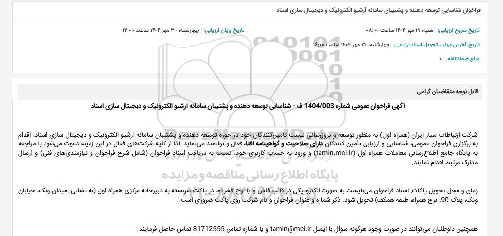 آگهی فراخوان عمومی شماره 1404/003 ف - شناسایی توسعه دهنده و پشتیبان سامانه آرشیو الکترونیک و دیجیتال سازی اسناد