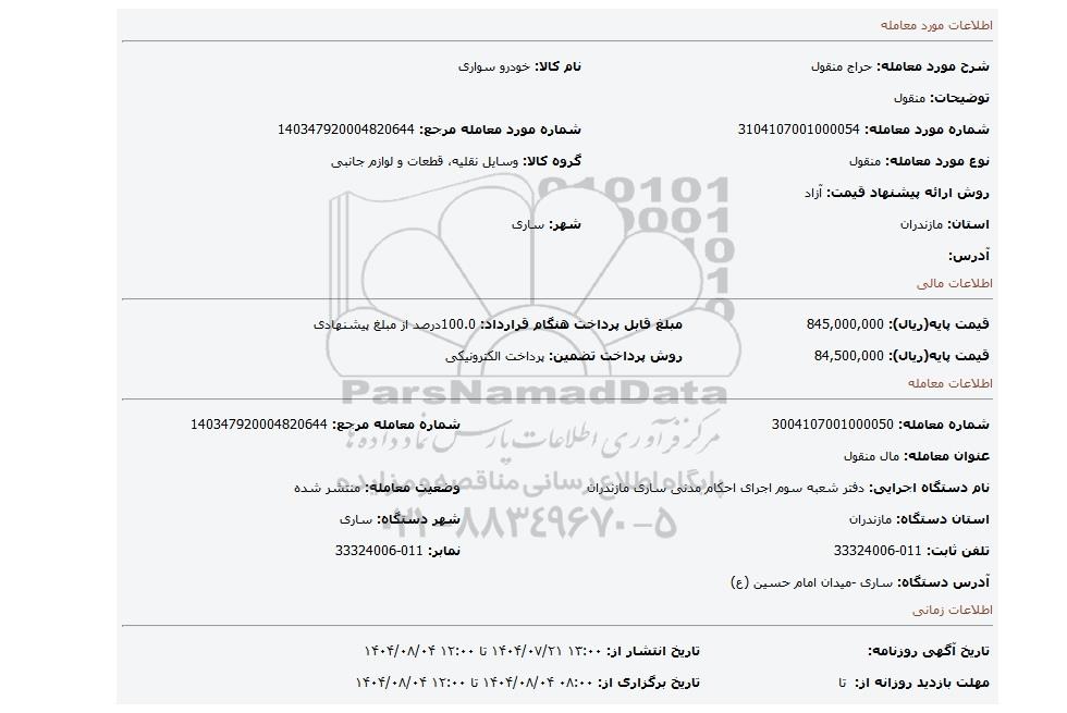 مزایده عمومی مزایده منقول برگزار میگردد. از کلیه افراد متخصص و شرکت‌های واجد شرایط دعوت به عمل می‌آید تا در این مزایده با کد خبرگزاری پارس نماد : 9694423 شرکت نمایند تاریخ شروع مزایده : 1404/07/21 مهلت شرکت در مزایده: تا پایان روز 1404/08/04 مکان برگزاری اموال واگذاری استان‌های مازندران و دسته‌بندی‌های مربوط به این حراجی ماشین آلات سنگین و نیمه سنگین, انواع خودرو سبک میباشد.