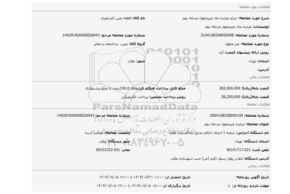 | عنوان معامله: مزایده غیرمنقول مرحله دوم | ||